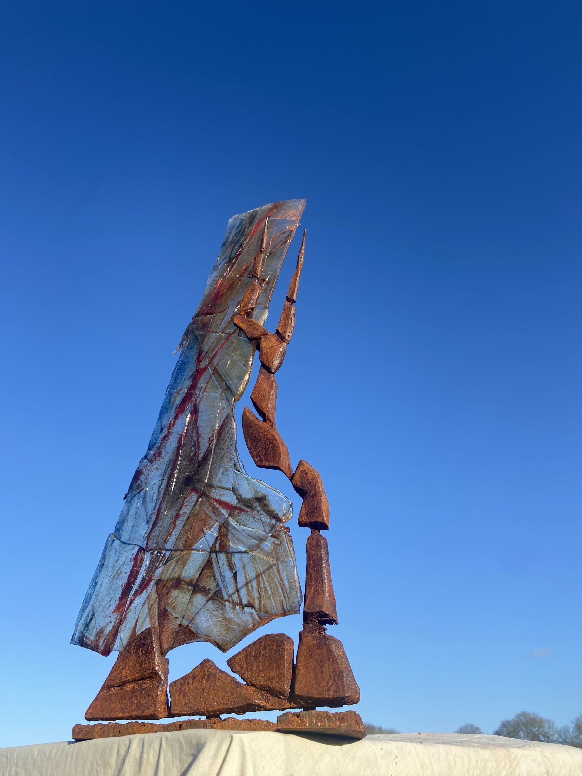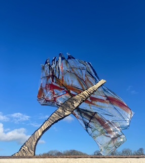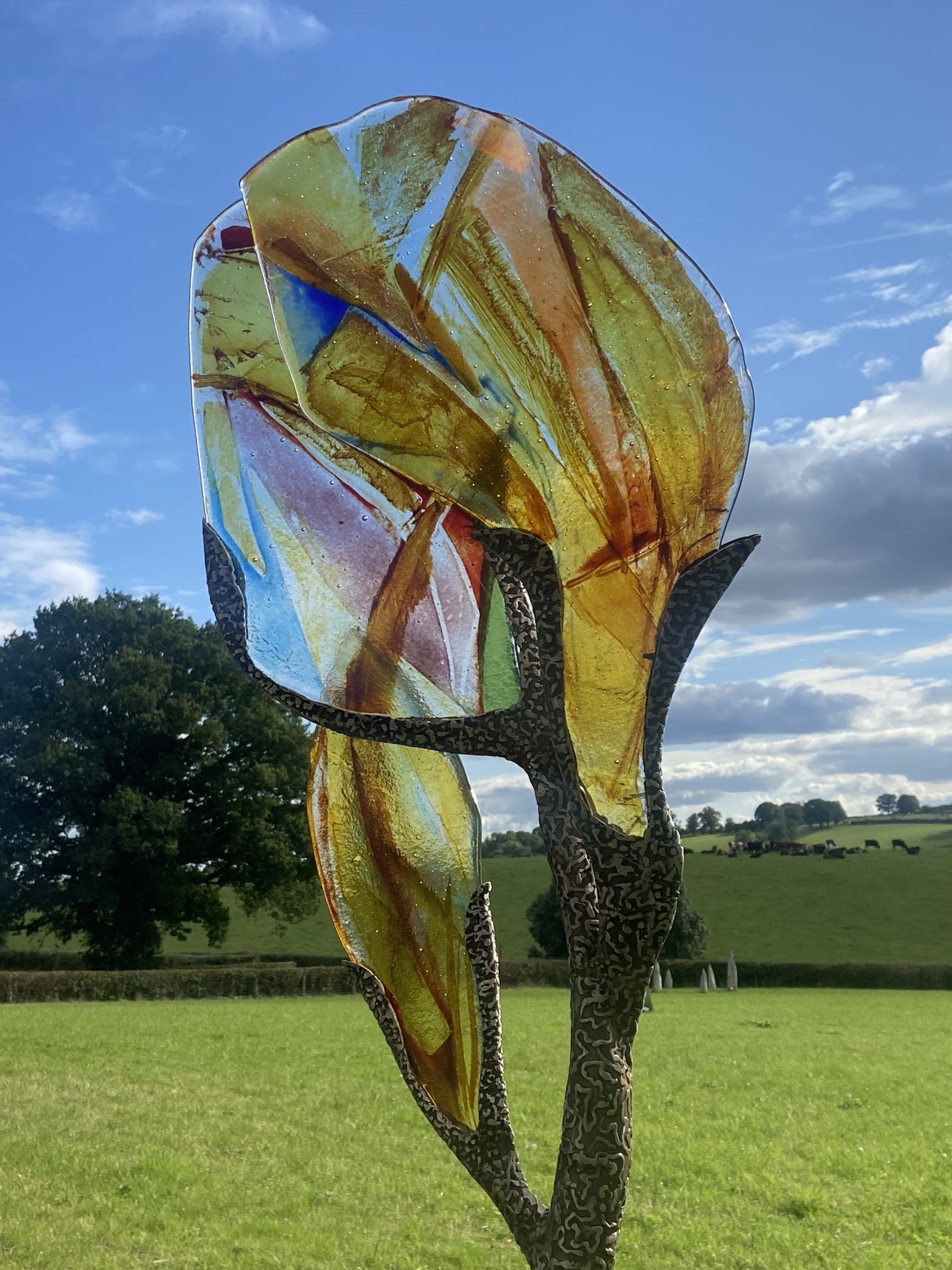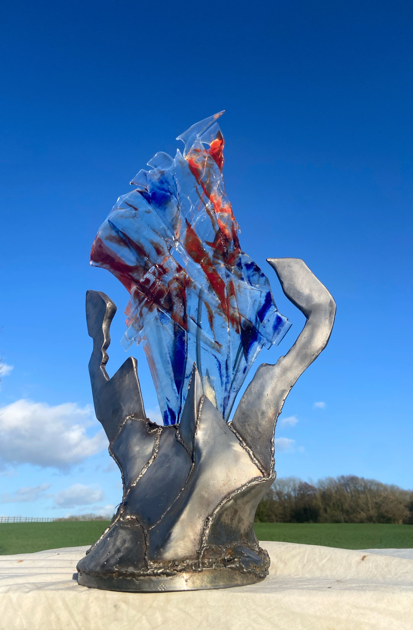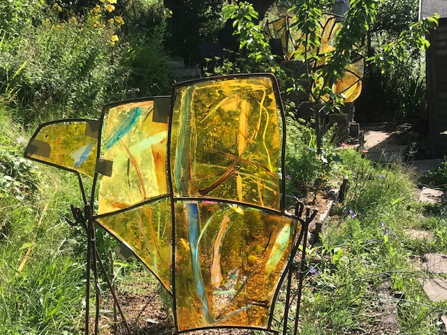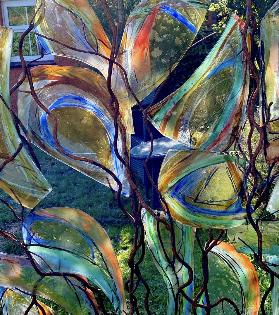 For the past 4 years Ian Richardson, a skilled metal sculptor and fabricator, and I have been collaborating to create large metal and glass structures. The steel responds to and secures the glass, enhancing its vibrancy and allowing it to respond to and be placed in the natural environment. We create both large structures secured on solid three pronged and staked bases and smaller indoor pieces. You can see our work here. I also create small, framed, jewel like pictures in dichroic glass.