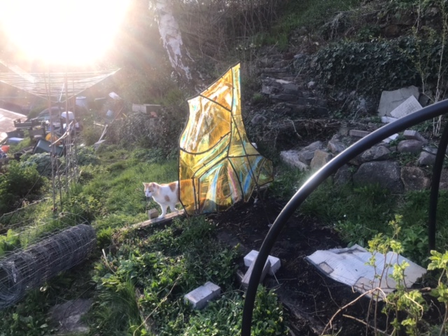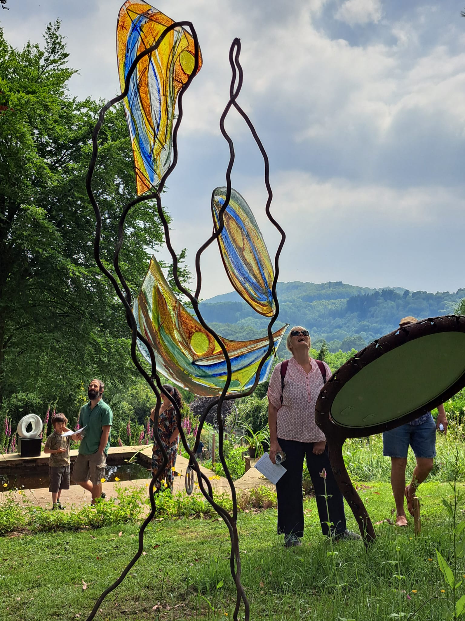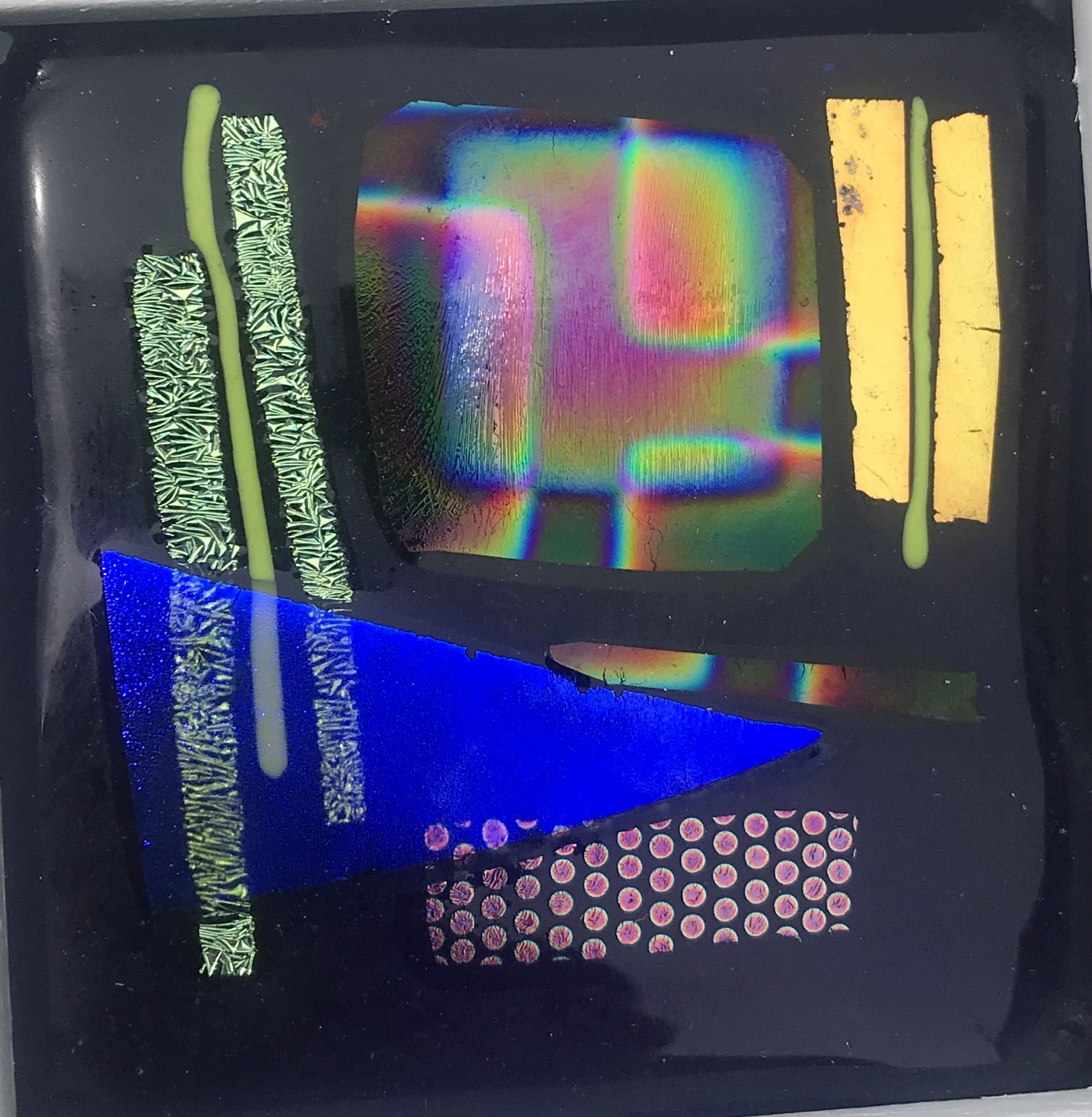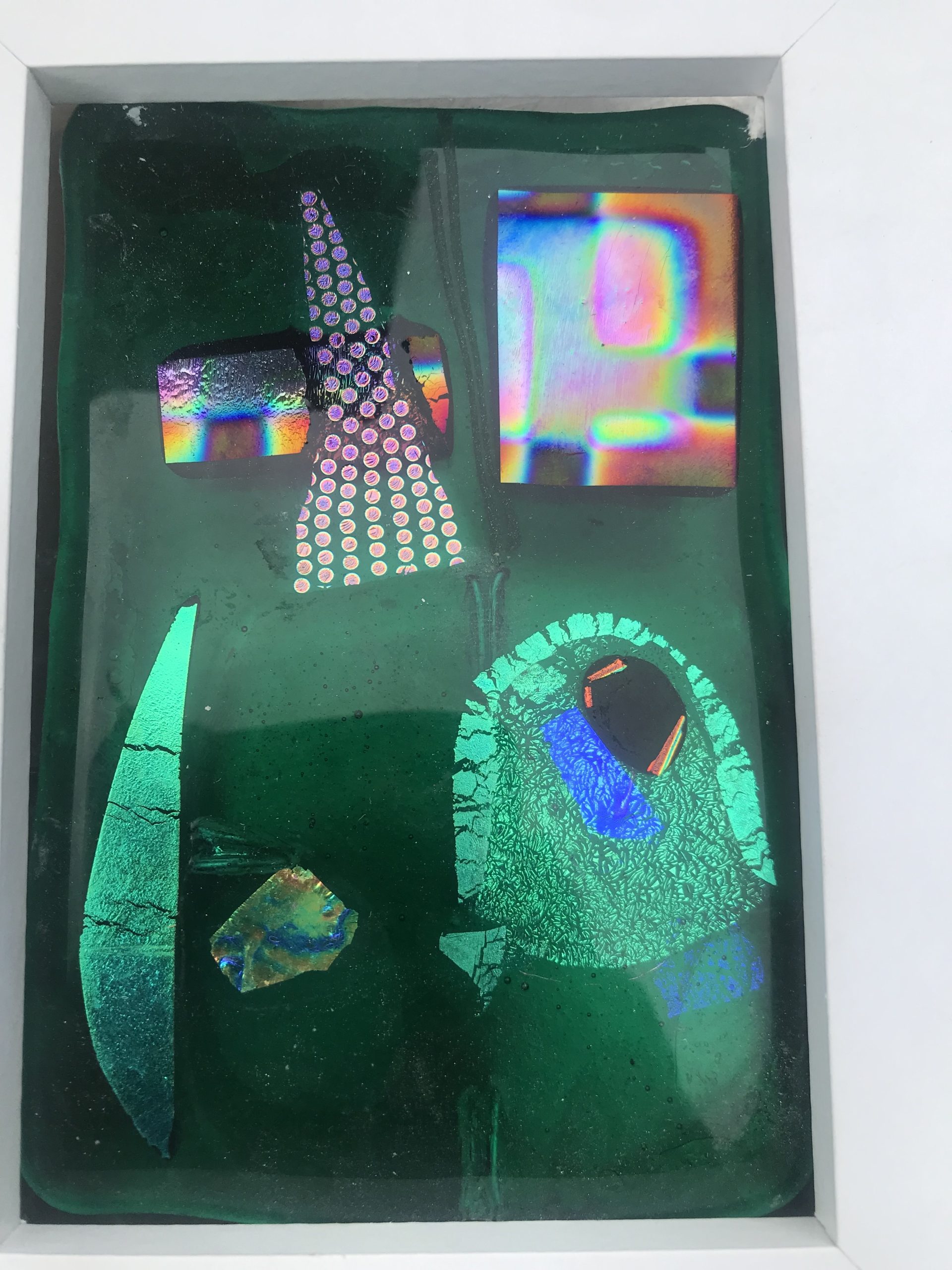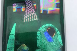 For the past 4 years Ian Richardson, a skilled metal sculptor and fabricator, and I have been collaborating to create large metal and glass structures. The steel responds to and secures the glass, enhancing its vibrancy and allowing it to respond to and be placed in the natural environment. We create both large structures secured on solid three pronged and staked bases and smaller indoor pieces. You can see our work here. I also create small, framed, jewel like pictures in dichroic glass.